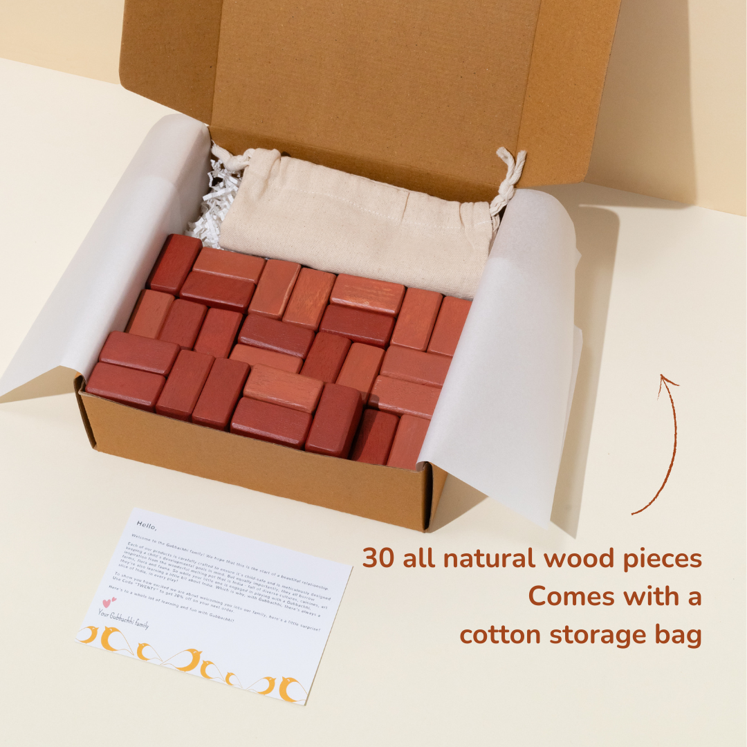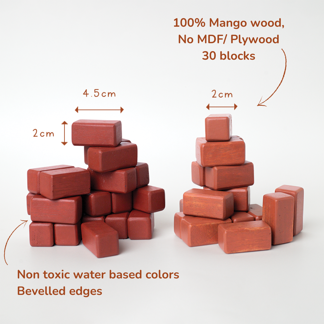 1: 30 wooden bricks handmade using 100% all-natural mango wood in shades of terracotta and brown. No MDF or plywood used.