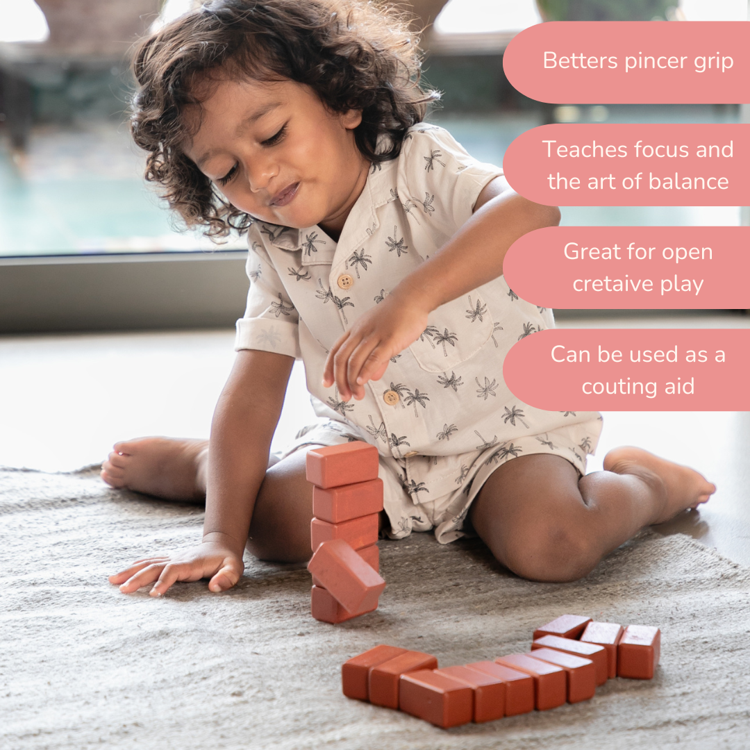 From spectacular skyscrapers dotting India's cities, to historical monuments, to quaint homes in the countryside - all of them have an integral element that helped shape them...the humble red brick. Our Eenta (that's Hindi for brick) Building Blocks are inspired by these little clay bricks that are the ones holding the largest edifices together. Made for open-ended play for young minds so your little builder can get busy constructing their own dams, bridges and little monuments.