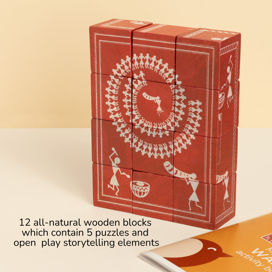 1: Set of 12 puzzle cubes. Made using all-natural wood. No MDF or plywood used. Arrange the cubes to form 5 different Warli-inspired paintings. There's also an open play element built into one face of the puzzle set.