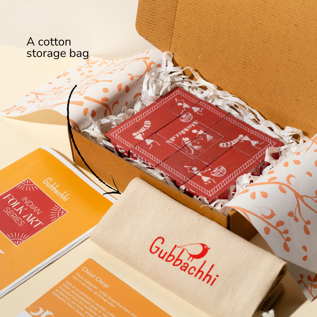 The Gubbachhi Folk Art Series draws inspiration from India's rich legacy of folk arts - where playful fun meets a folksy vibe! This set of 12 wooden puzzle blocks borrows from Warli - a tribal art form from Maharashtra, traditionally painted using natural pigments on mud walls