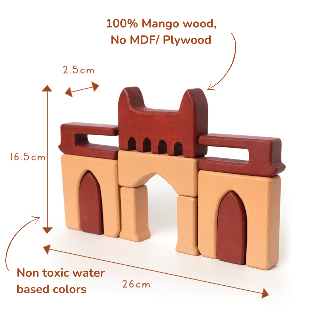 Standing tall at the Mumbai Harbour, overlooking the Arabian Sea, is the iconic Gateway of India. Our Gateway of India Wooden Stacker is inspired by this majestic monument. Part of our 'Indian Monuments' series, this stacker is complete with bricks, arches and doorways that fit together into a miniature Gateway. Sure to ignite a love for Indian landmarks, for the little historian-cum-architect at home!