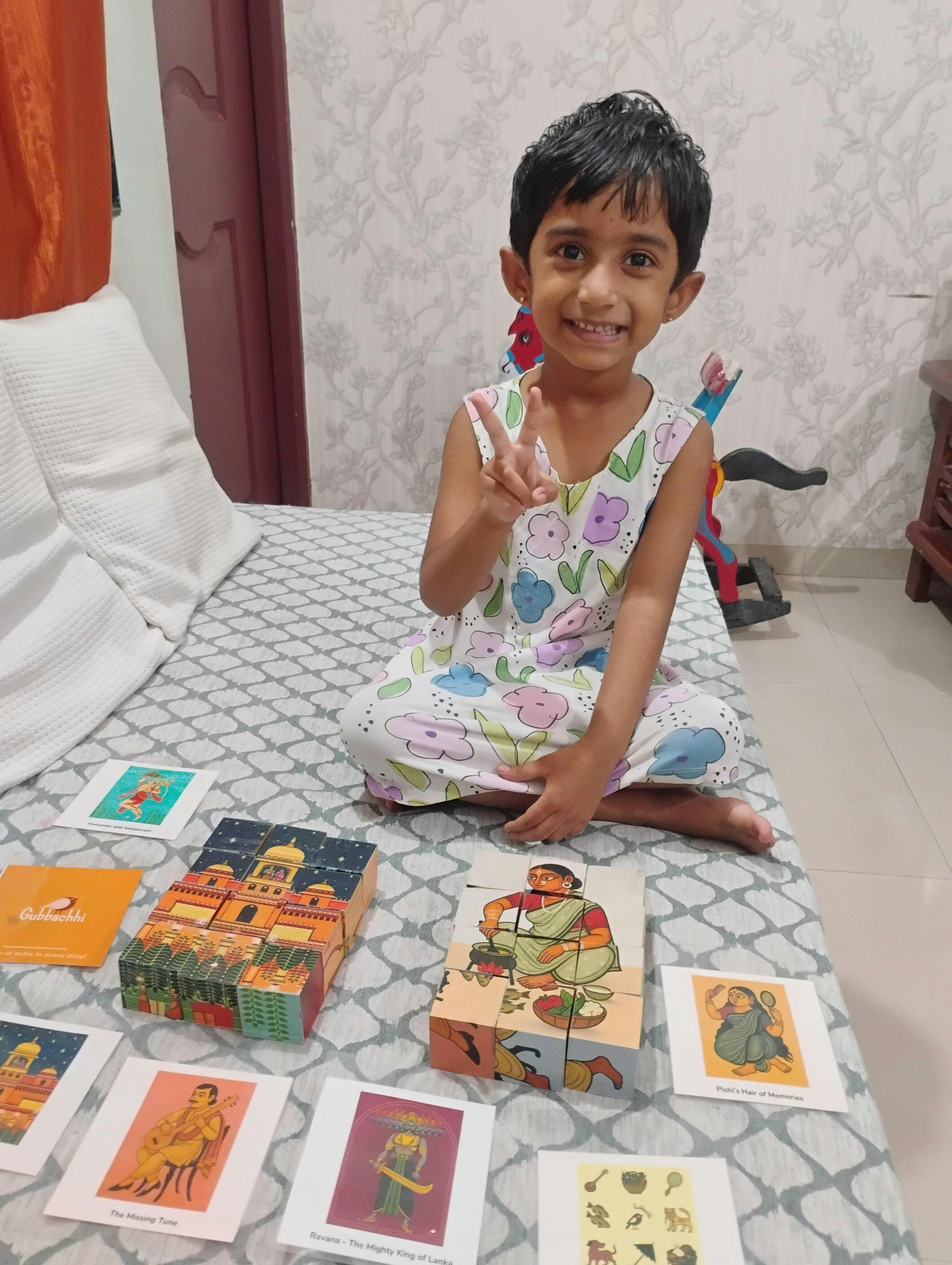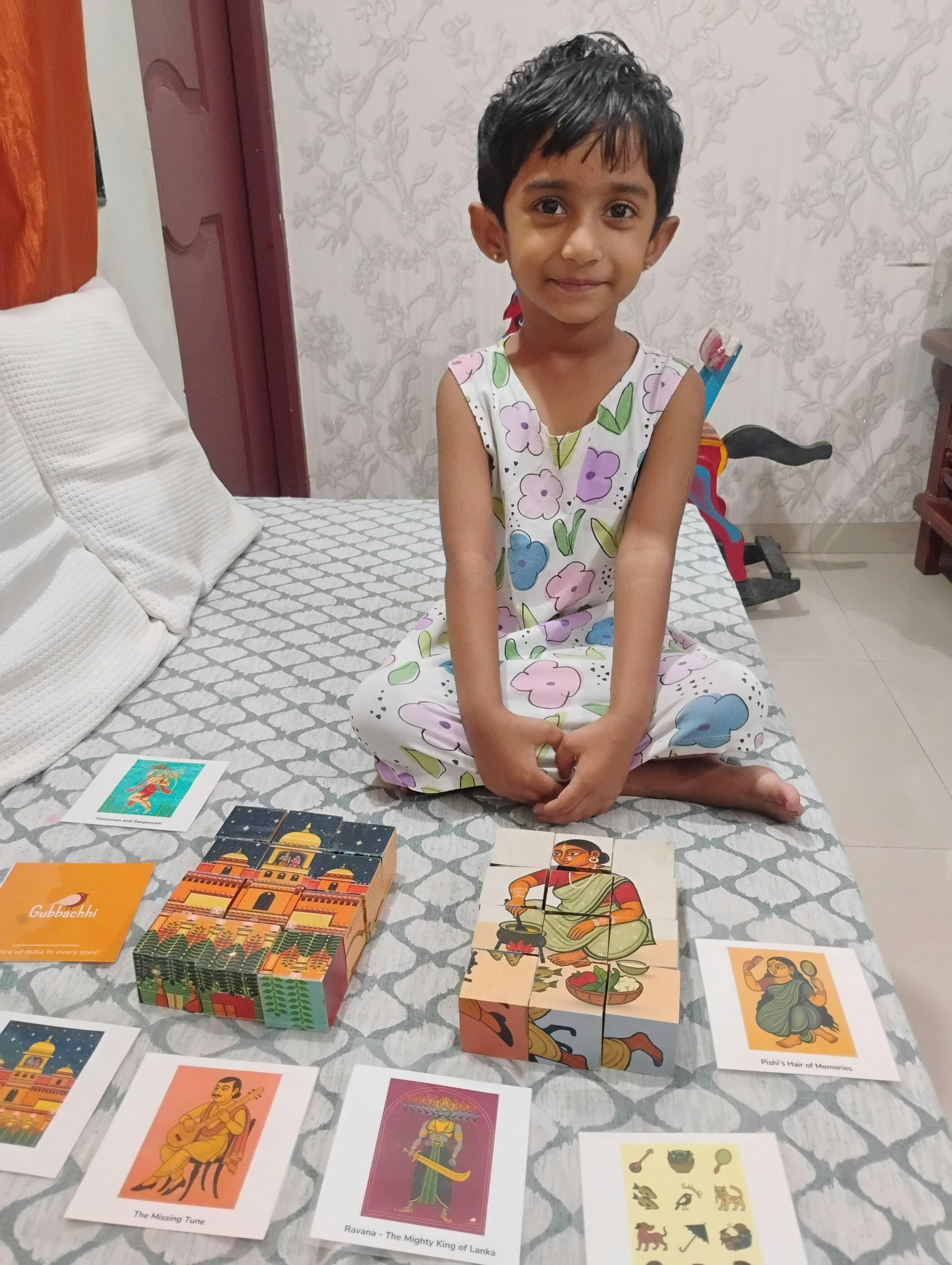 1. Bringing back to the roots: My niece was born in Europe, now she is living in Bengalore, I wanted to gift her something that will connect her to her root, Bengal. It was difficult to choose anything that will attract the little girl's mind, make her curios and proud of her Bengal. Gubbachchi's puzzles themed on Kalighat potochitro, Madhubani and Warli painting, Ramayana's episodes create the magic to engage the children arrange the blocks. I saw the instant result.