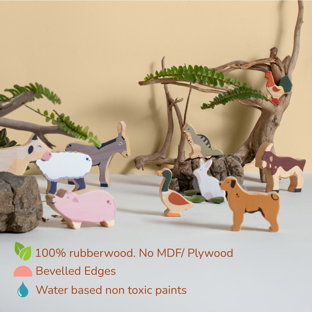 * 10 Wooden Farm Animals - dog, donkey, pig, sheep, rooster, duck, cow, goat, cat and rabbit