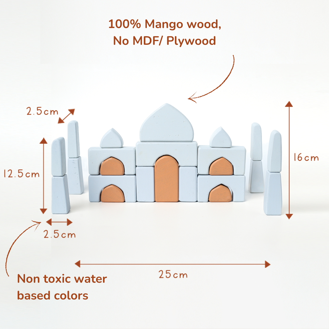 The Taj Mahal Wooden Stacker is our tribute to the crown jewel of Indian monuments - the Taj Mahal - an enduring symbol of love and beauty. Part of our 'Indian Monuments' series, the Taj stacker consists of domes, doorways and minarets - that come together to form the distinct silhouette of the most famous Indian landmark. Perfect for that little budding architect!